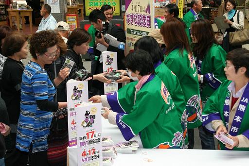 4月17日の「なすび記念日」に合わせJA熊本市茄子部会は16日、同市のサンロード新市街アーケード内で特産ナス「肥後のでこなす」をPRしました。全国有数の産出量を誇る冬春ナス産地を生産者自らが市民にアピールし、一層の消費拡大につなげる意向です。
