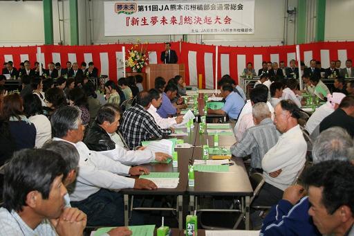 JA熊本市柑橘部会は5月7日、第11回通常総会・新生夢未来生産者総決起大会を同市河内町のJA夢未来柑橘選果場で開きました。部会員や荷受市場15社、地元県議・市議、行政やJA関係者ら約480人が参加。「売れるミカン作りを生産者一人一人が実行し、信頼される夢未来みかんブランドを築き上げよう」などとする大会決議を採択しました。