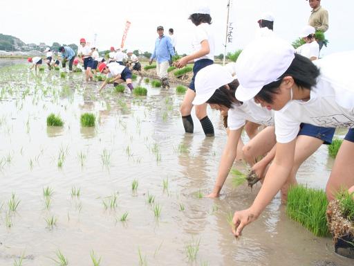 熊本市河内町の白浜水田保全組合は6月14日、児童の農業体験学習を同町で開き、市立河内小学校の5年生29人が田植えを体験しました。農地・水・環境保全向上対策事業の一環で、JA熊本市河内支店が共催。