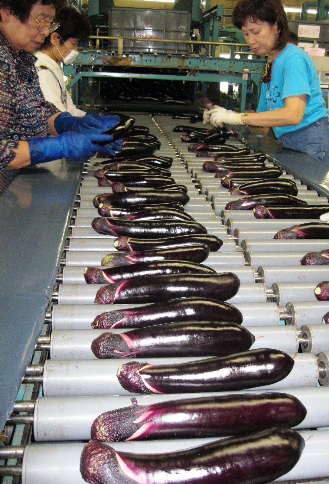熊本市会富町のJA熊本市野菜選果施設で9月20日、同市西南部で生産が盛んなナス「肥後のでこなす」の出荷が始まりました。昨年度より5日早い初日は約6トンのナスを選果。長さ20〜24センチ程度のL・2Lサイズを中心に1500ケース《1ケース4キロ》を中京や中国、九州などに向け出荷しました。