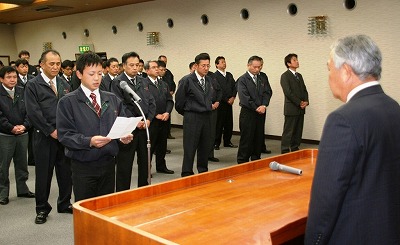 年頭にあたり、村上一也組合長ら役員5人があいさつ。村上組合長は「本格実施される農家の戸別所得補償の注視に加え、環太平洋経済連携協定(TPP)や農協事業分割化の問題もJAグループが一体となり断固反対の運動を展開していこう。組合員の皆様から信頼される組織となるための事業展開を職員一人ひとりが自覚をもって取り組んでもらいたい」と訓示しました。誓いの言葉として力合支店の布川雄一朗さんが「職員一人ひとりがJAの果たす役割を自覚し、組合員や利用者から信頼されるJAを目指してまいります」と力強く語りました。