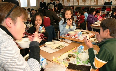 JA熊本市女性部の部員ら22人は1月19日、同市の山ノ内小学校を訪れ、児童と給食を食べて交流しました。毎月19日の「食育の日」に合わせ、地産地消を推進しようと熊本市教育委員会が主催。