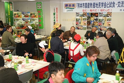 熊本市農畜産物生産出荷協議会(熊本市・JA熊本市・同JA生産部会)は2月18日、同市で熊本市農産物産地見学会と試食・交流会を開きました。昨年に続き2回目。観光客や消費者にJAブランド「夢未来くまもと」の農畜産物を優先的に提供してもらい消費拡大につなげようと、ホテル・レストランの料理人や市場、量販店、給食関係者ら47人を招待しました。