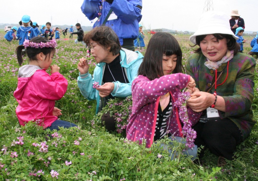 熊本市沼山津のJA熊本市秋津カントリー一帯で4月23日、第4回秋津ふれあいれんげ祭り2011が開かれました。秋津地区の自然や伝統文化の素晴らしさを知ってもらおうと、地元の営農組合などでつくる実行委員会主催。家族連れなど大勢の地域住民らが訪れ、満開のレンゲを満喫しました。