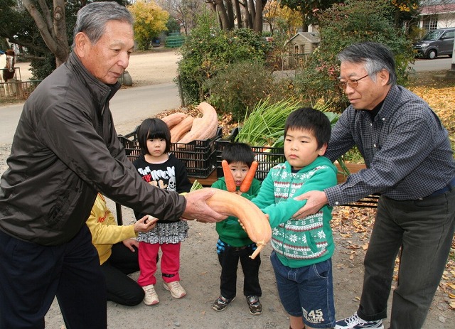 「縁起の良いカボチャを食べて元気に過ごしてください」と藪田委員長が野菜を贈呈。同園子供ホーム園長の西浦健輔さんは「冬至のカボチャ料理や正月の雑煮などを皆でおいしくいただきます」と話しました。