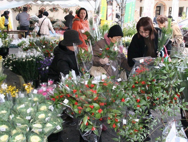 キクやセンリョウなどの生け花やしめ縄飾り、おせち料理惣菜などを多数品揃え。取れたての野菜や果物のほか、精肉や鮮魚なども販売しています。購入者にはつきたてのきなこ餅が振る舞われ、米のつかみ取りイベントなどもあり盛況でした。