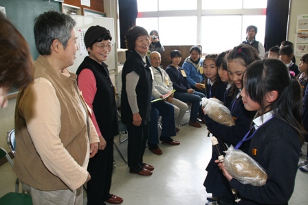 同JA女性部供合支部は味噌作りの指導や調理指導の他、毎年16㌔の手作り味噌を納入しており、学校給食に使用されています。同日8㌔の味噌を児童に手渡しました。児童らは「市販の味噌で作った味噌汁よりも美味しかったです。また手作り味噌が来るのを楽しみにしています」とお礼を述べました。