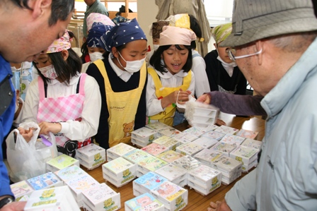 3月13日、市内の高平台小学校の3年生約90人が、自分たちが育てた大豆で作った納豆の販売を体験しました。商品パッケージは児童らがデザインしたもの。「美味しい納豆いかがですか」と威勢良く買い物客らに声を掛け、納豆が売れると大喜び。限定540パック(1パック3個入り200円)を約2時間で完売しました。