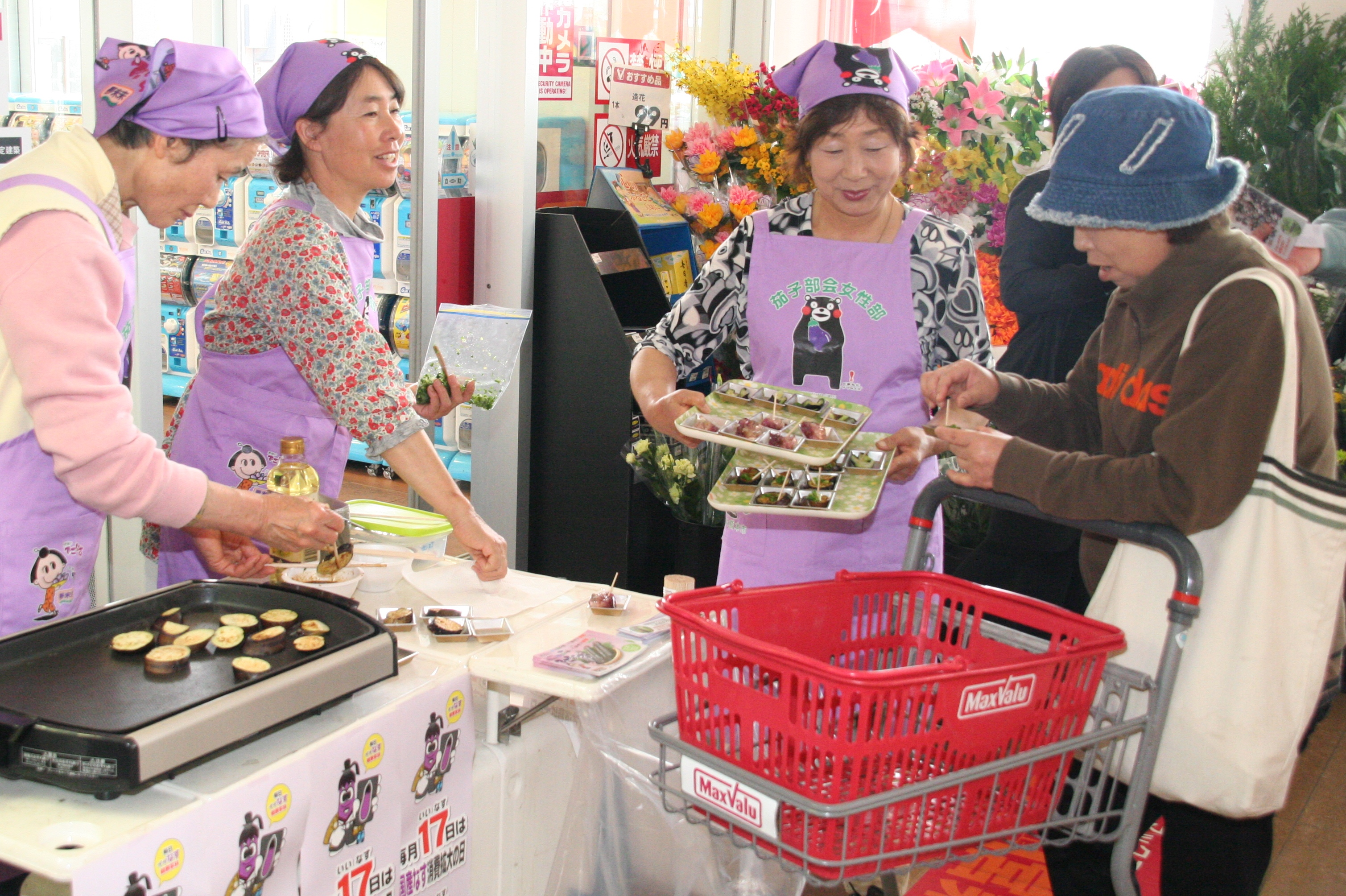 この日、同市のスーパー・マックスバリュ(西熊本店・内坪井店)で、生産者の女性が素材を生かした料理を買い物客にPR。焼きなす(生姜醤油風味)とナスゼリーの2品を試食してもらいました。ナスを買い求めた消費者は「肥後のでこなすはアクが少なく料理に使いやすい。これからたくさん出回るので、様々な料理に使いたい」と話していました。