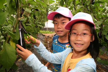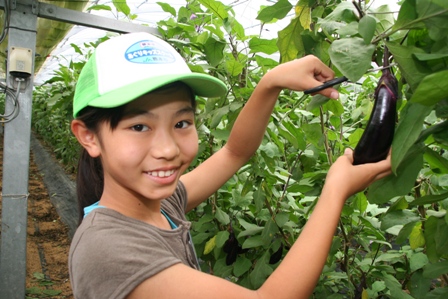 スクール生らはJA職員から苗の植え方の説明を聞くと、土の感触にはしゃぎながら水田(約5㌃)に入り、横一列になり丁寧に植え付けました。近くの耐候性ビニールハウスではナスの収穫を体験。熊本市がナスの市町村別生産量が1位だという説明を受けると子どもたちは驚いた様子。ナスはハサミを使い収穫しました。