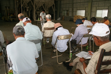 | 栽培のポイントの説明を聞く生産者ら(6月2日、JA秋津カントリーエレベーターで) |