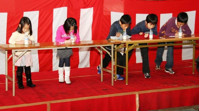 牛乳早飲み大会でストローを使って精一杯吸い上げる子どもたち