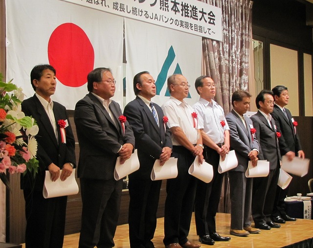 熊本県JAバンク運営協議会は9月21日、市内ホテルで平成22年度JAバンク熊本推進大会を開きました。JAバンク運営協議会委員及びJA信用担当者ら約130人が、「農業メインバンク・生活メインバンク」の機能強化に向けた具体的取り組みを確認しました。