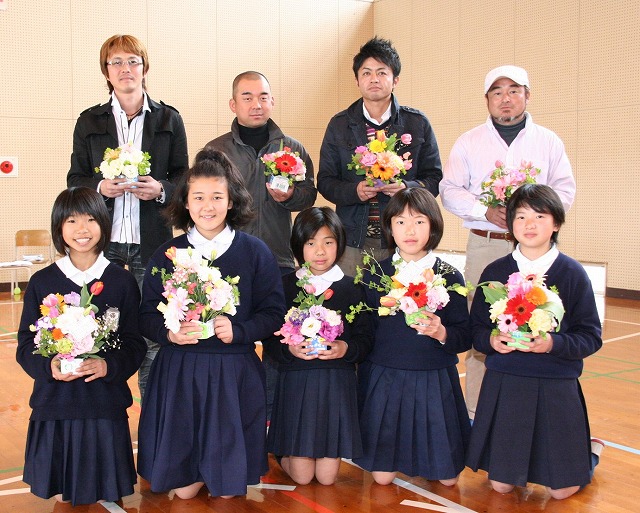 部会長の原口和大さんがトルコギキョウの生産概況を説明。生花店を営む同小卒業生らを講師に招き、児童たちは生産者と一緒に作業しました。彩りやバランスなどを考えながら、環境に配慮し牛乳パックに入れたオアシスにアレンジしました。初めて体験した西本圭佑君は「『ありがとう』の気持ちを込めた。喜んでもらえるとうれしい」と話していました。