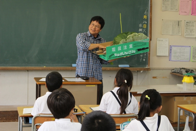熊本日日新聞社とJA熊本中央会の共同企画である「くまもとあぐりん」に、レンコン生産者である辻野正敏さんが取材を受けられました。(7月23日の熊本日日新聞朝刊に掲載)。辻野さんは地元の中島小学校を訪れ、3年生の児童にレンコンについて説明し、一緒に給食を食べました。この日は、辻野さんが育てたレンコンがレンコンチップになって登場。児童たちは大喜びで食べていました。