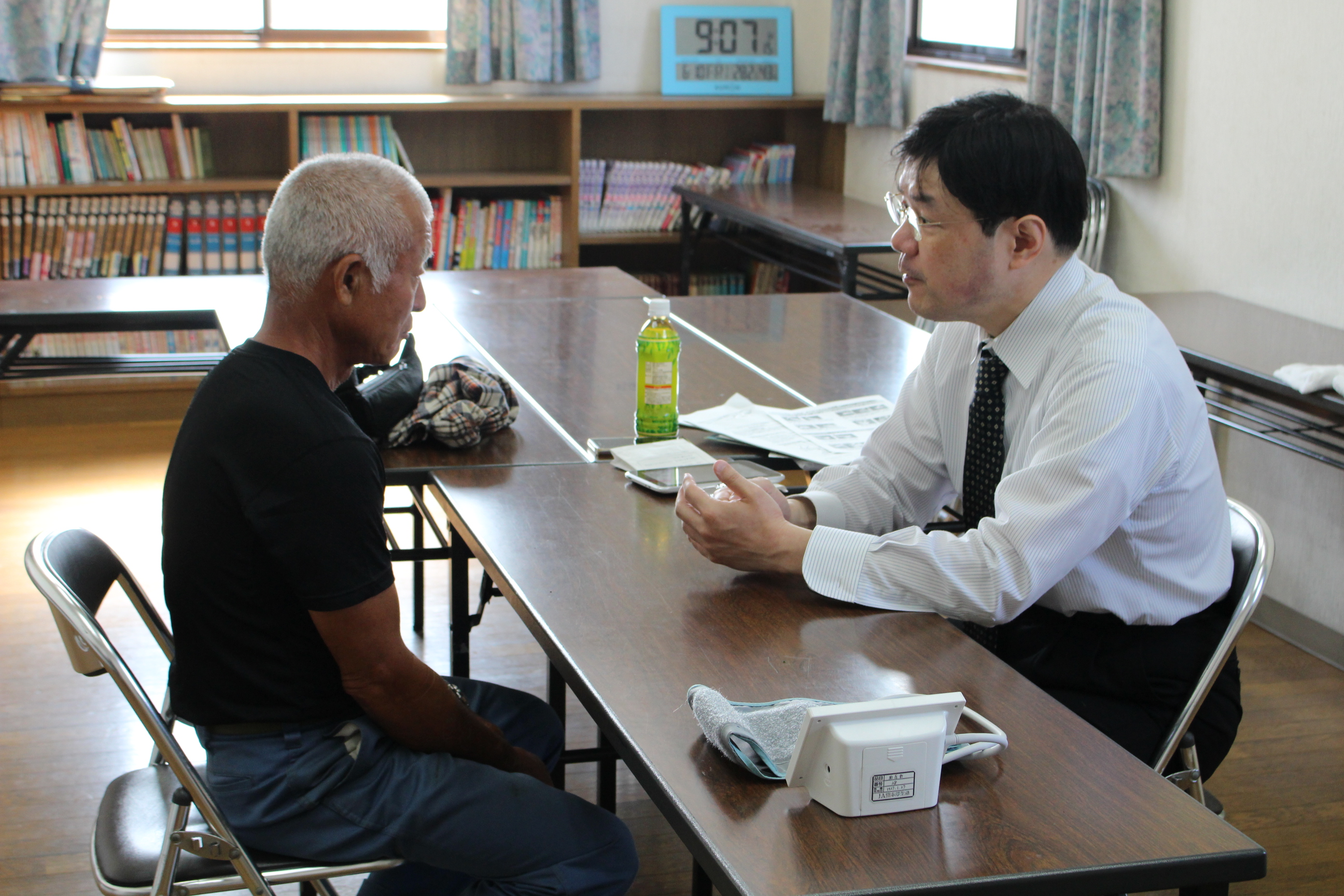 6月10日は同公民館で健康診断を開きました。JA熊本厚生連が無償で協力。組合員はじめ地域住民、男性12人、女性14人の計26人が診察に訪れました。JA熊本厚生連健康管理センターの粟津雄一郎先生が、血圧測定や問診など、1人に数十分かけて診察しました。