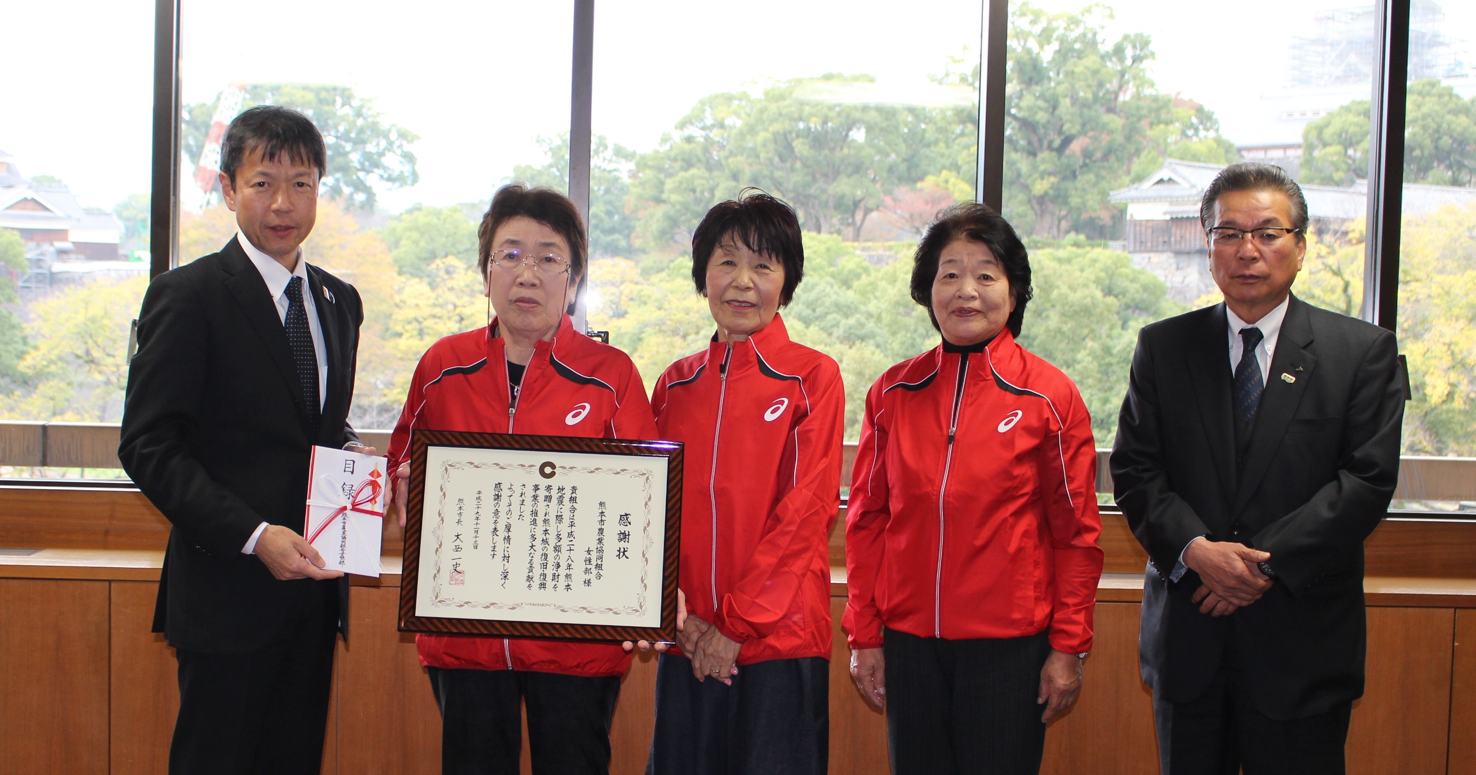 11月13日、宮本隆幸組合長と田島イツ子女性部長ら4人が熊本市役所を訪れ、10月14日、15日に開催された「KAB元気フェスタ2017」でのチャリティー販売の売上金を「熊本城災害復興支援金」に全額寄付しました。