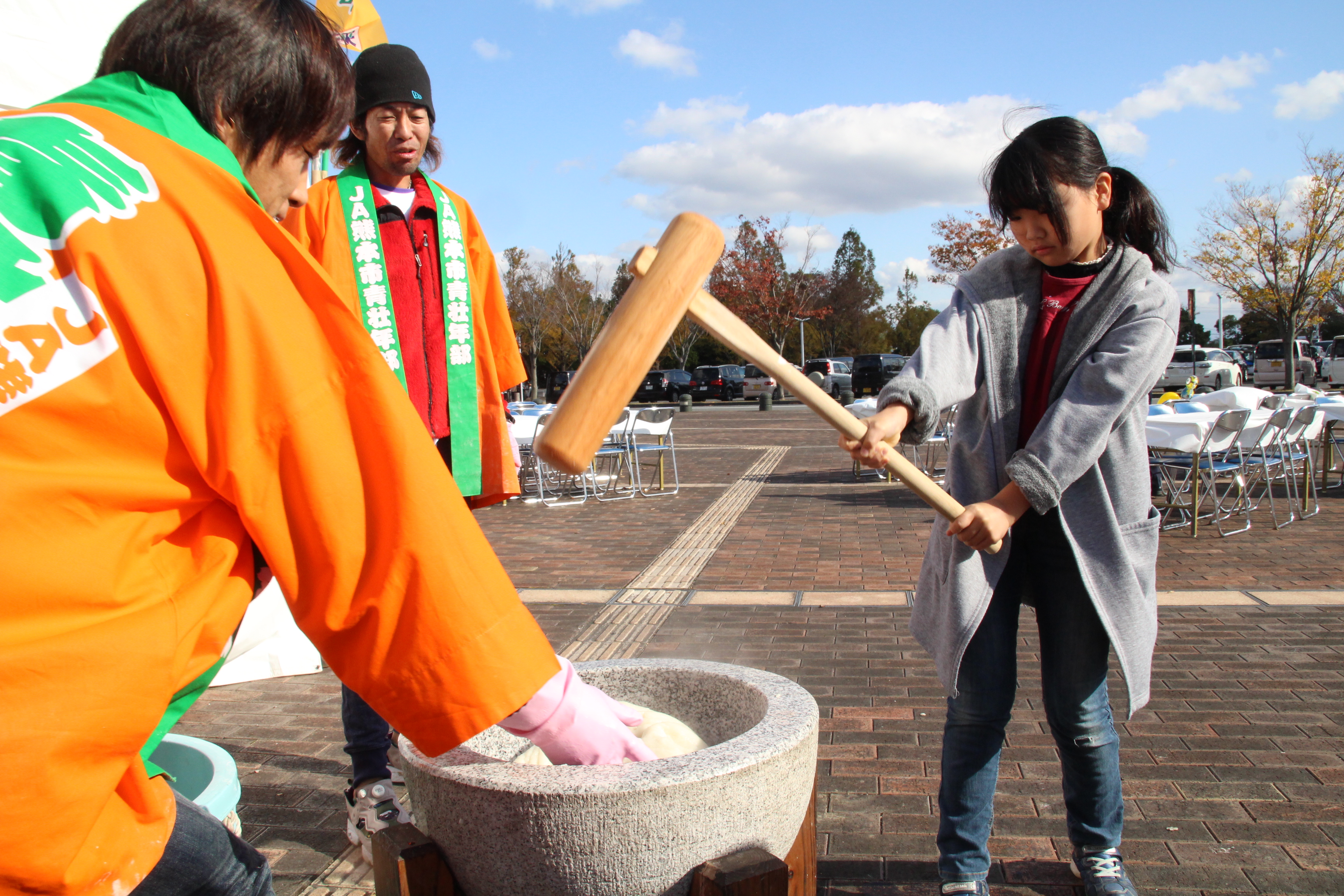 JA熊本市夢未来農業祭2017(アクアドームくまもと開催)で、収穫した野菜の販売と餅つき体験をしました。