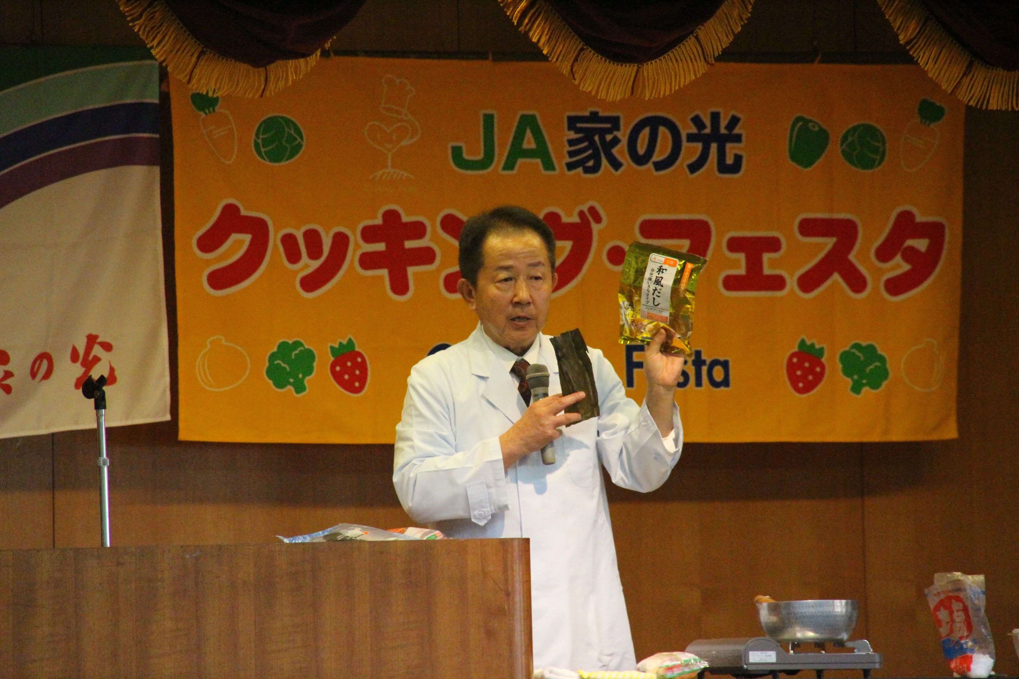 女性部員やハイミセス・FD会員の他、「家の光」新規購読者など約130人が参加。テレビでお馴染みの料理研究家宮本和秀先生を講師に迎え、地元で採れた安全・安心な農畜産物を使ったオリジナル献立を振る舞いました。